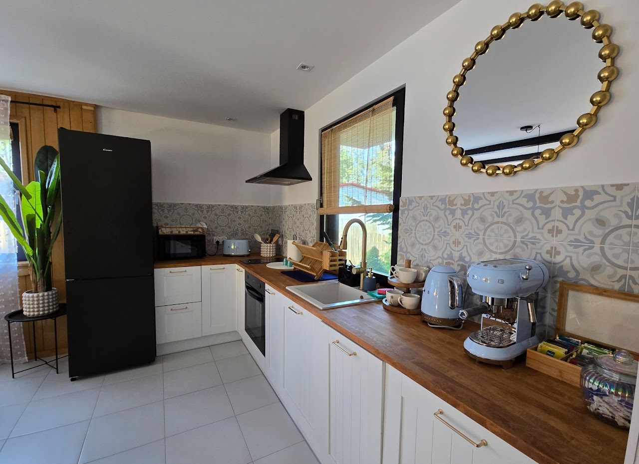 Bosko Siemiany to również w pełni wyposażona kuchnia. Goście znajdą w niej zmywarkę, piekarnik, płytę grzewczą, mikrofalówkę, dużą lodówkę z zamrażalnikiem, a także toster, czajnik i ekspres do kawy firmy SMEG.